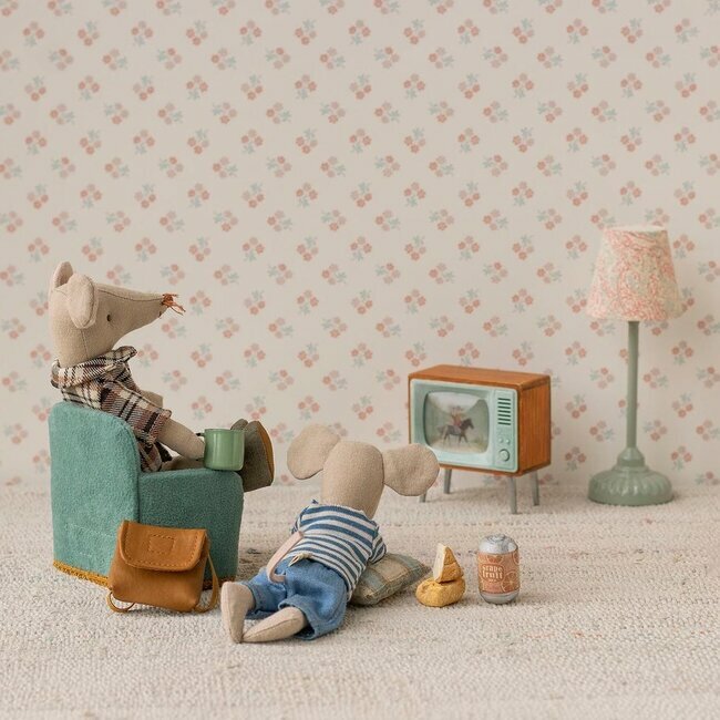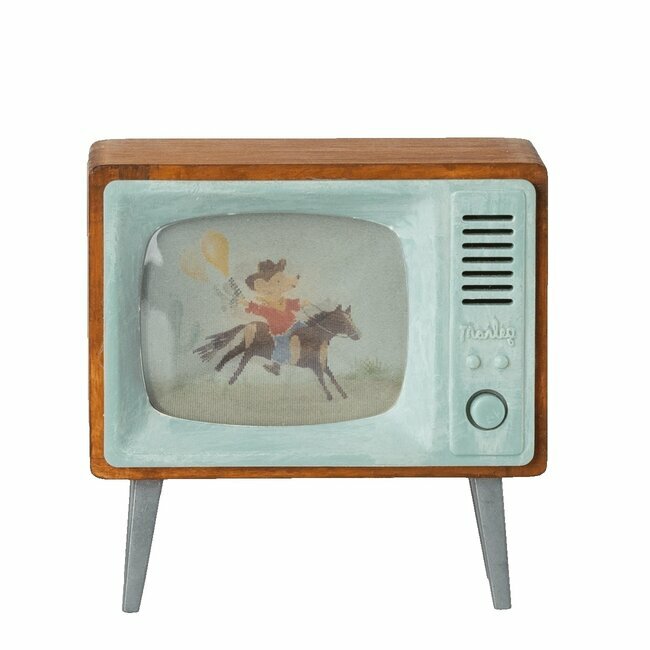 Cette mini télévision à l'allure totalement rétro est idéale pour apporter encore plus de convivialité dans les intérieurs de vos petites souris Maileg ! Ajoutez une pile bouton et l'écran pourra s'allumer et s'éteindre... pour un effet 100% réaliste !