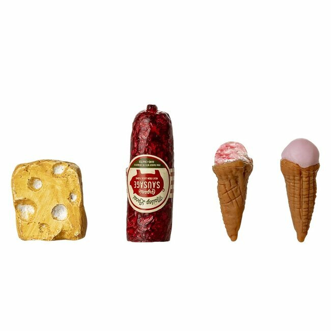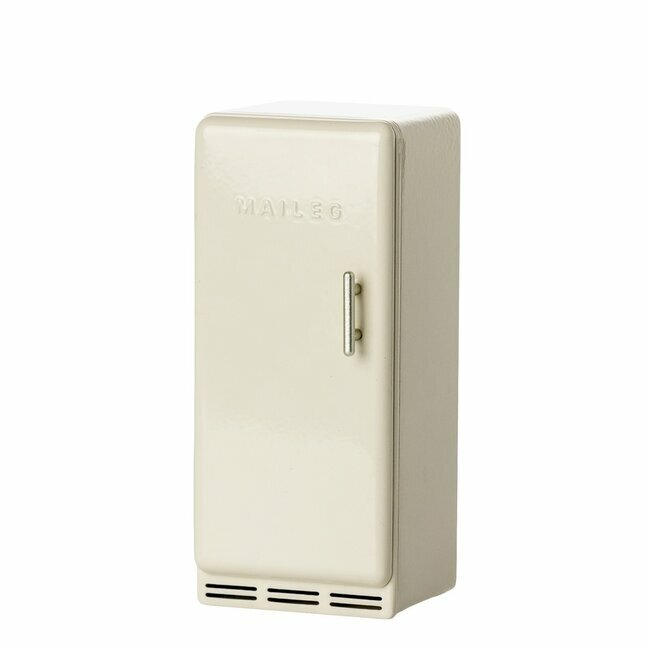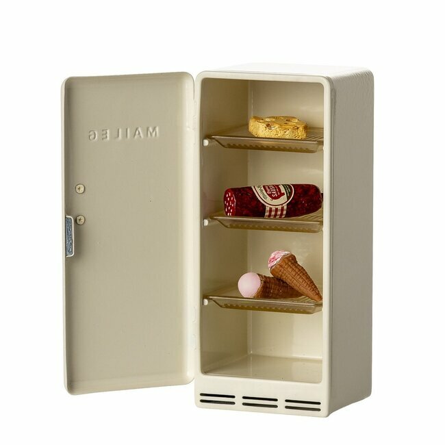 Un réfrigérateur vintage qui s'intègre parfaitement à la maison souris Farmhouse Maileg. À l'intérieur du réfrigérateur, vous trouverez un morceau de fromage, une saucisse et deux glaces pour régaler toute la famille souris.
