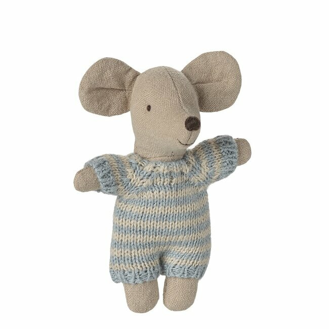 Un adorable bébé souris vêtu d'une combinaison, en tricot, douce et rayée. Bébé souris dort pendant des heures dans son couffin matelassé et peut être transporté dans toutes vos escapades.
