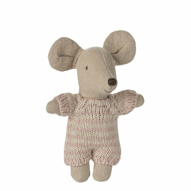 Un adorable bébé souris vêtu d'une combinaison, en tricot, douce et rayée. Bébé souris dort pendant des heures dans son couffin matelassé et peut être transporté dans toutes vos escapades.