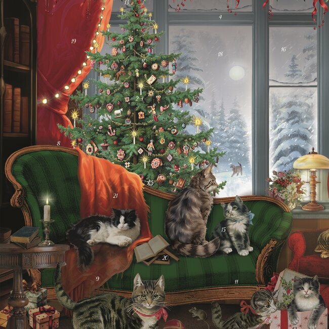 Coup de coeur pour ce merveilleux calendrier de l'avent avec ruban de suspension qui représente une adorable scène avec des chats dans un intérieur rétro avec un magnifique décors de Noêl. Chaque image cachée derrière les 24 cases à ouvrir correspond au décors principal pour le transformer avec magie.