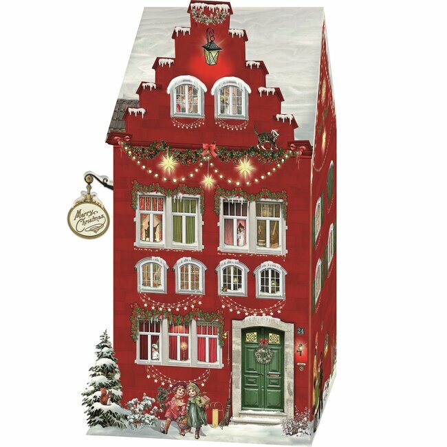 Coup de coeur pour ce merveilleux calendrier de l'avent qui représente une superbe maison de Noël avec 24 fenêtres à ouvrir. Son éclairage LED intégré illumine toute la maison d'une douce lumière lorsque vous appuyez sur le sapin en bas de la maison.