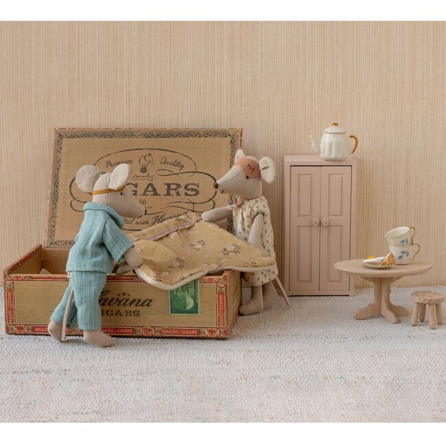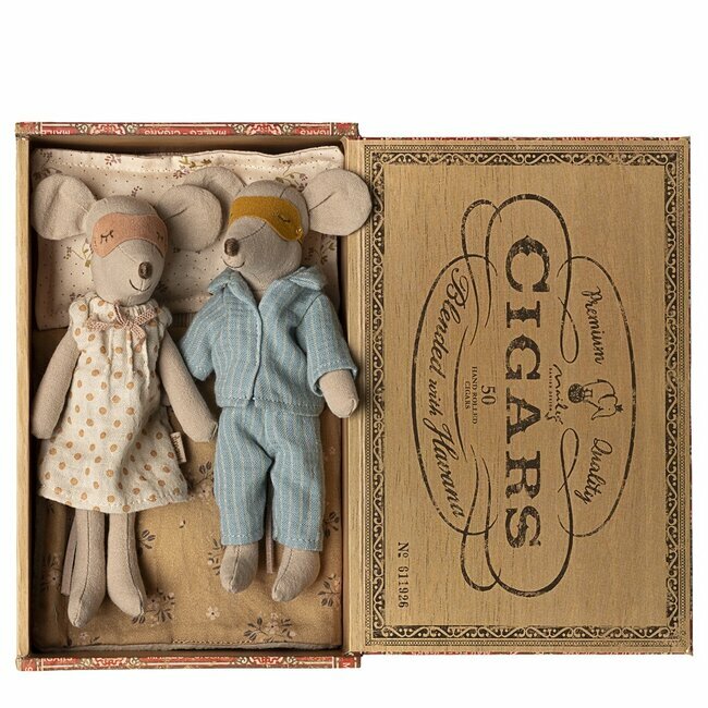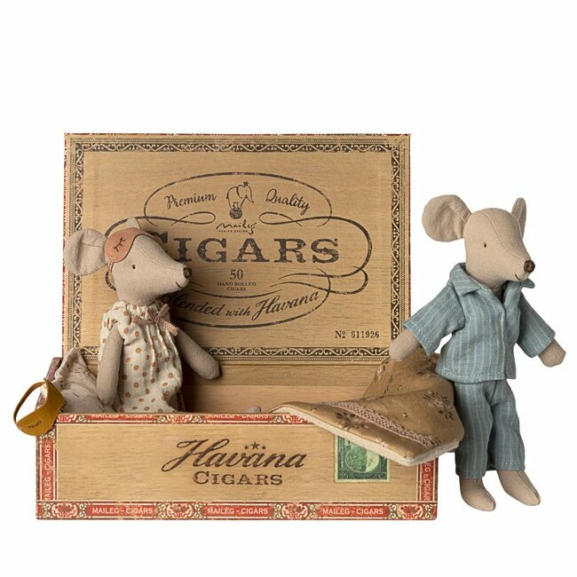Les enfants seront totalement enchantés par cet adorable couple de parents souris Maileg, vêtus de leurs tenues de nuit avec leur masque pour dormir. Confortablement installés dans leur jolie boite à cigares transformée en lit, avec leur petit matelas, leurs 2 oreillers et leur couverture.
